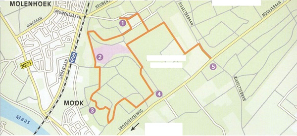 De route leidt verder door een afwisselend loof- en naaldbos, waar zomereiken en grove dennen domineren. Nog tot begin twintigste eeuw was dit een 'uitgestrekt heidegebied. Rond 1920 werd het gebied ontgonnen en werden er vooral grove dennen aangeplant. Verderop kom je langs de Mookerschans 3, die de vorm van een vierkant heeft. Deze ligt net als de Heumense Schans op zo'n 40 meter hoogte. Bij 4 moet je even opletten om de afslag naar links niet te missen; het gele paaltje staat pas verderop langs het pad. Bijna aan het eind van de route wandel je nog een stukje langs de andere kant van de Heumense Schans voordat je weer uitkomt bij het Jachtslot. Na afloop kun je nog naar 't Zwaantje 5, een herberg en restaurant waar je eventueel de route ook kunt beginnen (deze is dan 8 km in plaats van 5,5 km). Of ga naar restaurant De Schans 6 in Mook of het moderne pannenkoekenrestaurant Den Tol 7 in het nabijgelegen Plasmolen.