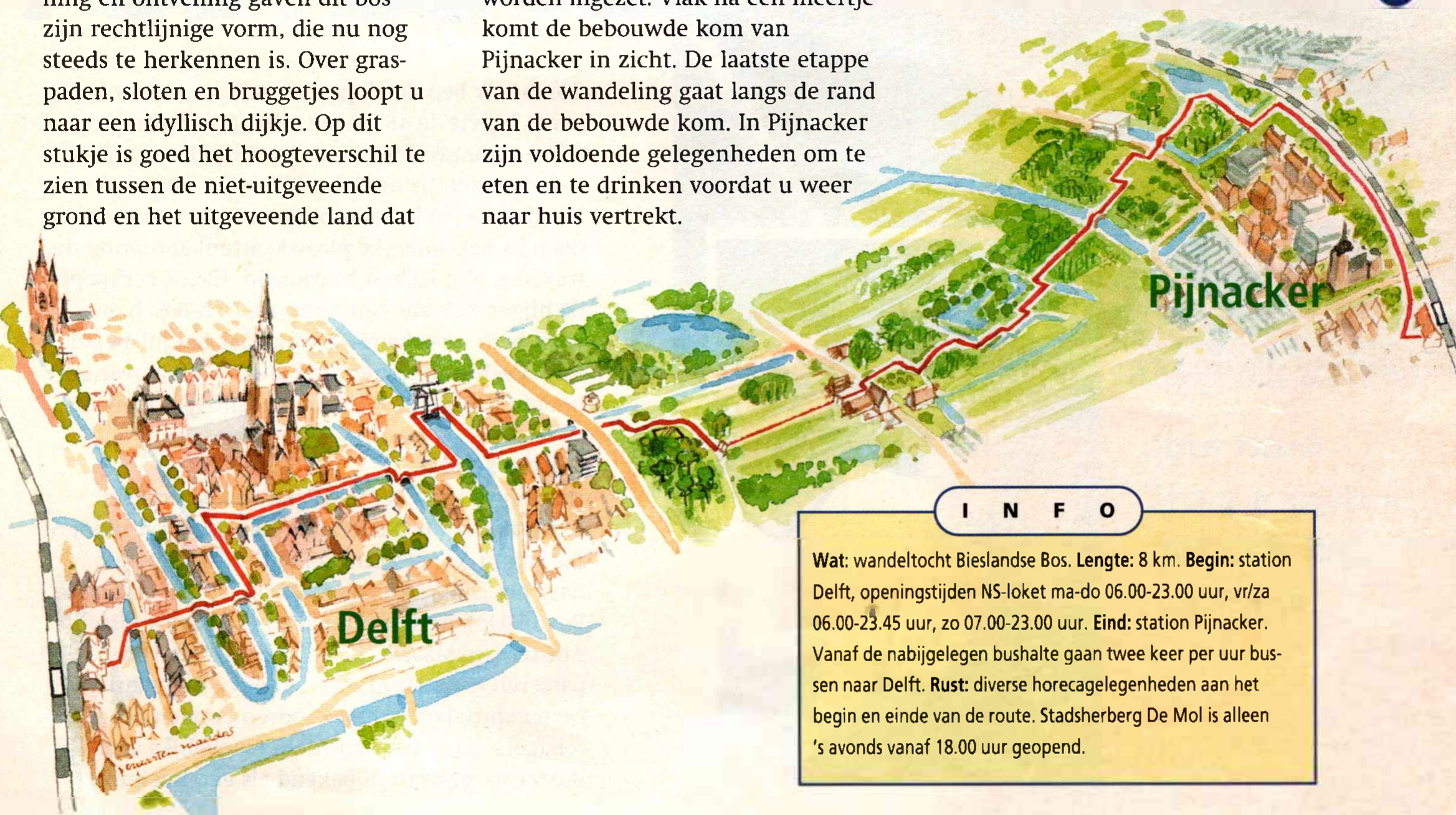 den aantreffen, die als begrazers worden ingezet. Vlak na een meertje komt de bebouwde kom van Pijnacker in zicht. De laatste etappe van de wandeling gaat langs de rand van de bebouwde kom. In Pijnacker zijn voldoende gelegenheden om te eten en te drinken voordat u weer naar huis vertrekt. Wat: wandeltocht Bieslandse Bos. Lengte: 8 km. Begin: station Delft, openingstijden NS-loket ma-do 06.00-23.00 uur, vr/za 06.00-2È.45 uur, zo 07.00-23.00 uur. Eind: station Pijnacker.