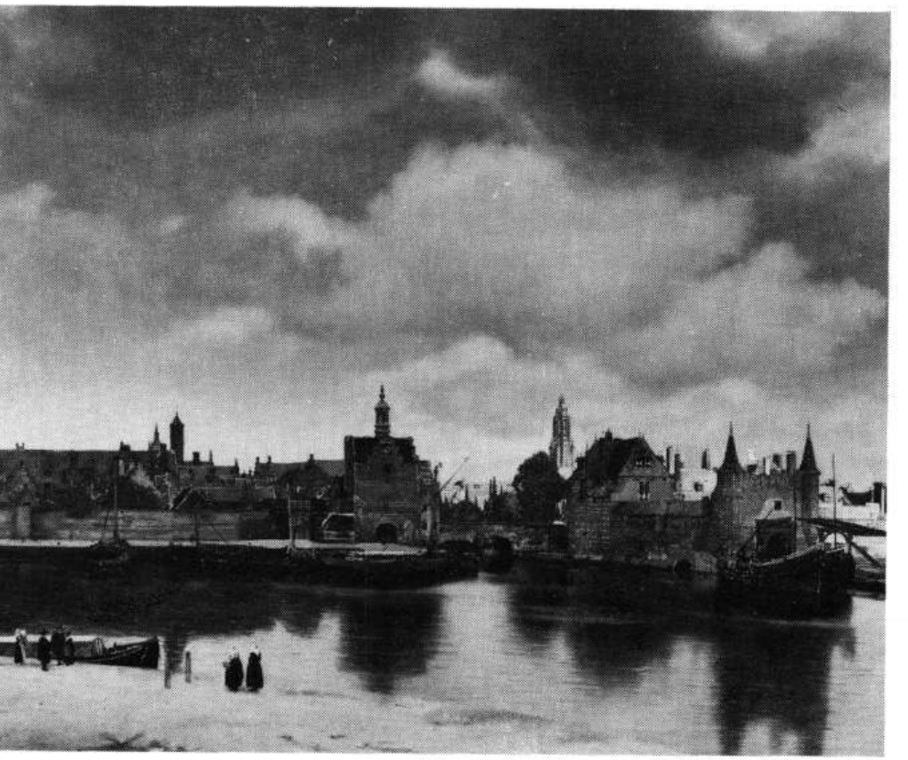 schilder Vermeer uit Delft stadsgezichten Het prachtige 'Gezicht op Delft' van Vermeer, met die zeldzame Hollandse kleuren. Het is een realistisch schilderij, dat wil zeggen, de schilder houdt zich aan de natuurvormen. M aar hij zag het met zo'n doordringende aandacht, dat dit dode stadsgezicht voor ons iets levends wordt. Kijk eens wat een heerlijk wolkenspcl met dat valse regenzonnetje. Kan het Hollandser?' '